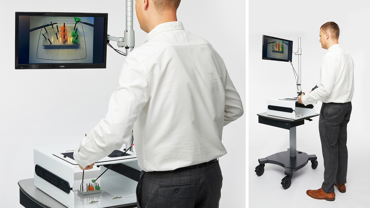 The FLS Trainer System comes with a Mobile Sim Cart and Monitor, offering greater flexibility for training centers. Included with the cart are optional flat feet for a permanently placed trainer, or the lockable wheeled feet can be used for a portable FLS station wherever needed.
